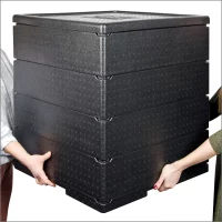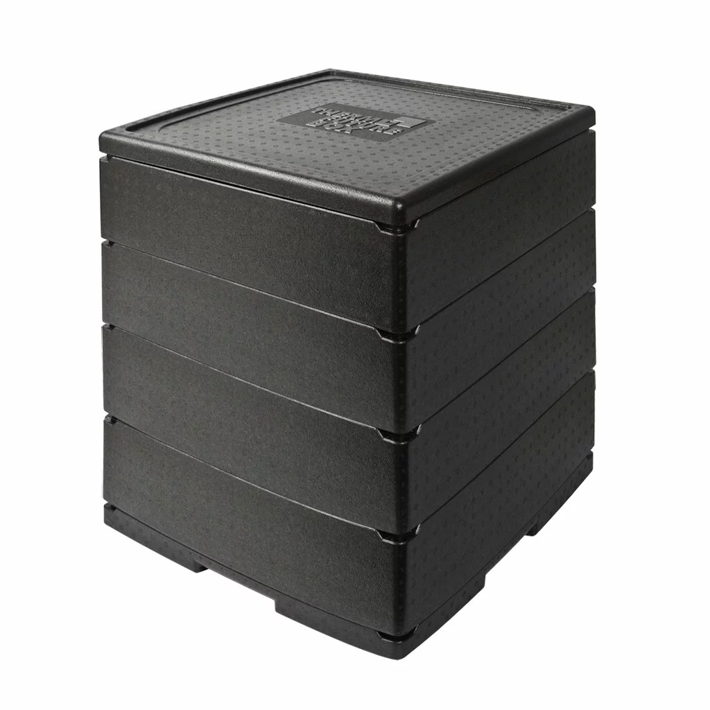 Fabricada en EPP (polipropileno expandido), es liviana, resistente y apta para uso alimentario, manteniendo la temperatura interna durante el traslado. Su base incorpora manillares ergonómicos y su diseño promueve la circulación de aire frío para evitar condensación, asegurando una entrega profesional con alto estándar higiénico y estético.