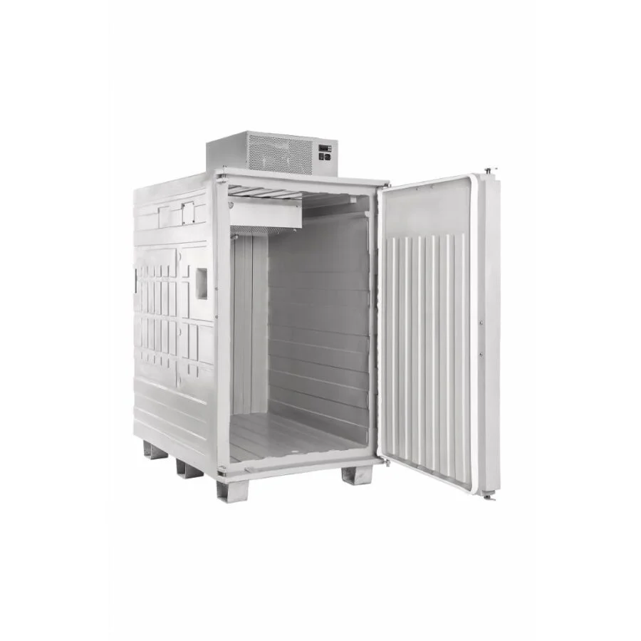 Contenedor refrigerado de gran volumen con apertura frontal, diseñado para transportar y almacenar productos sensibles a la temperatura. Equipa un compresor hermético con control digital programable (± 0,5 °C) y doble alimentación (12 V / 230 V), todo en carcasa de polietileno rotomoldeado con aislamiento de poliuretano sin CFC/HCFC.