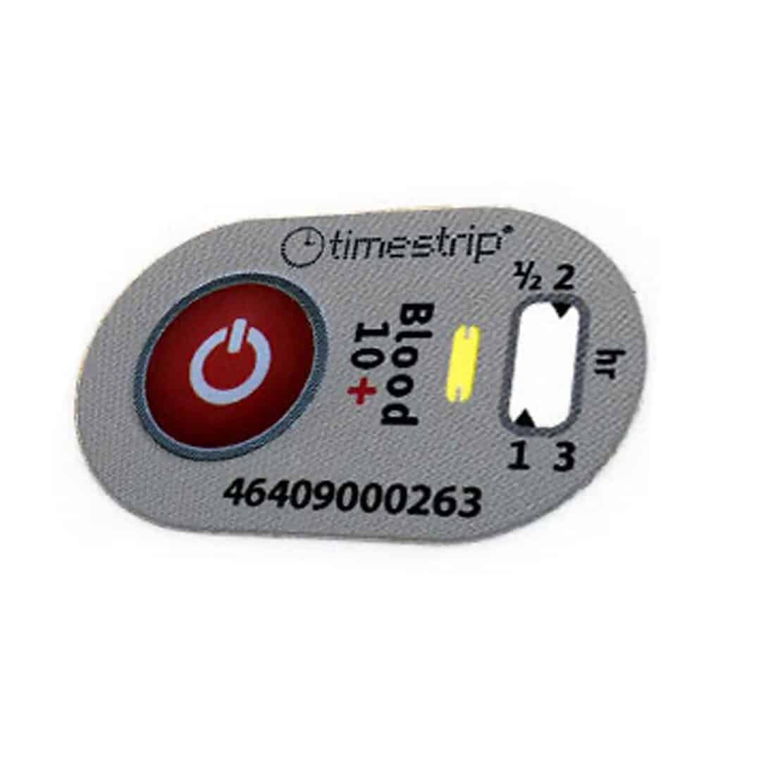 La ventana de ruptura permanecerá blanca mientras permanezca por debajo de la temperatura umbral. El Timestrip Blood Temp 10+ se puede aplicar directamente quitando el revestimiento adhesivo de la parte posterior.